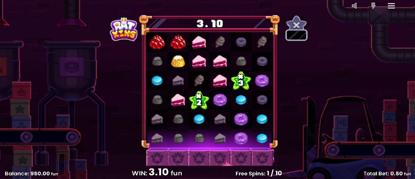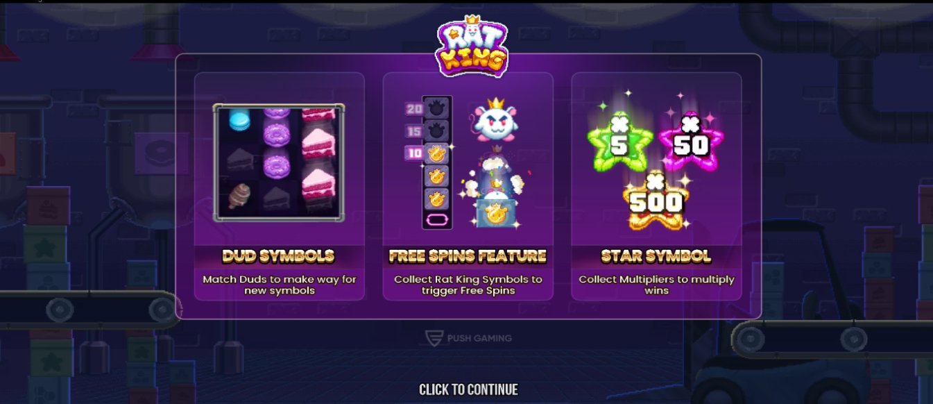 Der Spielautomat heißt Rat King, weil er sich um Süßigkeiten dreht. Der Rat King ist der König der Süßigkeiten. Das Spiel integriert dieses Thema in seine Geschichte und Symbole und schafft so ein unverwechselbares und einprägsames Erlebnis.